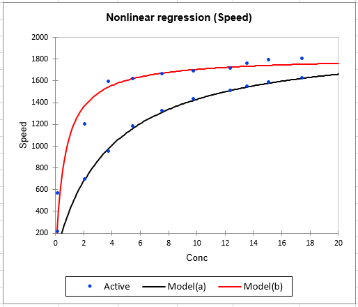 最初のグラフ(下図)は、データと適合されたモデルの曲線を表示し、各グループの最大速度が近いことを確認します。他のグラフは、残差を分析でき、とくにデータが数が重要なときに有用です。