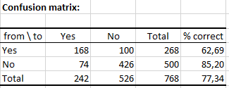 すべての変数の要約統計と相関行列が最初に表示され、オブザベーションの再分類を要約する混同行列が続きます。後者は、正しく分類できたオブザベーションの%を素早く見ることができます。それはオブザベーションの合計数に対する正しく分類できたオブザベーション数の比です。ここで、それは 77,3%に等しいです。