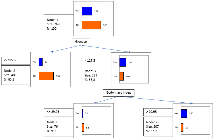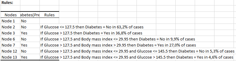 この方法で、"If Glucose <= 127.5 then Diabetes = No in 63,2% of cases" だとわかります。木構造の表でわかるように、このルールは、ノード純度80.6で、485 個のオブザベーション (データセットの63%) により検証されます。 次の結果は、分類木のパートです。