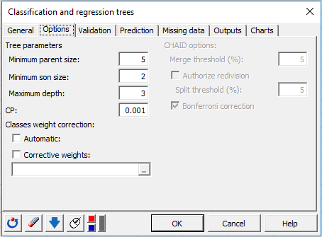 オプション・タブで、複雑すぎる木になるのを防ぐために、木の最大深さを3 に設定し、複雑度パラメータ (CP) の値を 0,001に変更します。つまり、全体の不純度が少なくともCP係数だけ減少しない限り、木の構築は継続しません。