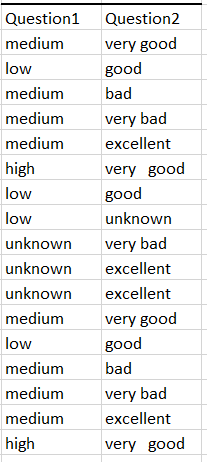データセットは、調査に対する回答を表す2個の順序カテゴリ変数を含みます。