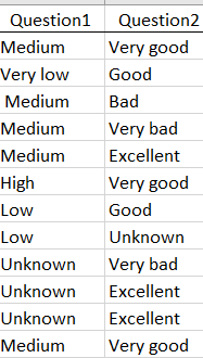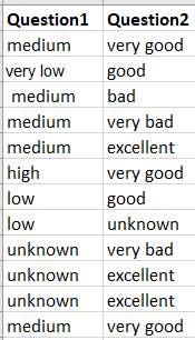 データセットは、アンケート調査に対する回答を表す2個の順序カテゴリを格納しています(下図)。我々の目的は、最初の単語の最初の文字を大文字にすることです。