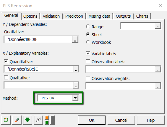 偏最小2乗判別分析をセットアップするには、偏最小2乗回帰ダイアログ・ボックスを使用します。 XLSTATを起動して、ExcelメニューのXLSTAT / データ・モデリング / PLS回帰 コマンドを選択するか、データ・モデリングメニューの対応するボタンをクリックしてください。
