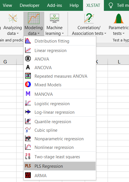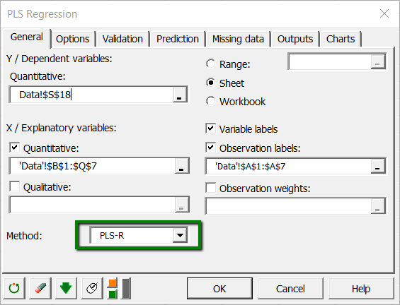 PLS回帰のダイアログ・ボックスを使用するには、まずXLSTATを起動して、XLSTAT / データ・モデリング / PLS回帰コマンドを選択するか、またはデータ・モデリングツールバーの対応するボタンクリックします。