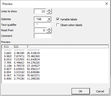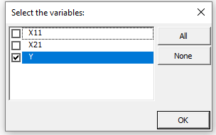 変数 Y を選択して、OK ボタンをクリックしてください。同じ方法で、説明変数フィールドで変数 X11 と X21 を選択してください。