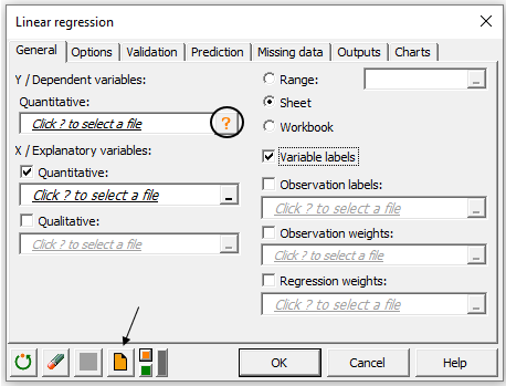 データ・ファイルを読み込むために、量的従属変数フィールドの隣のクエスション・マークをクリックしてください。