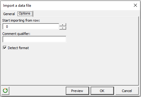 データ・ファイルを読み込むためのさまざまなパラメータを設定します。これらは a) 各列のセパレータを定義する区切り文字 (このデータ・ファイルでは、TABが使用されています)、b) 複雑な要素を定義するテキスト修飾子 (すなわち、スペース、区切り文字などを伴う要素)、c) ヘッダとして使用される最初の行をスキップできるようにする行フィールドでのインポート開始行(ここでは、スキップなし)、ファイル内でコメントされたテキストに必要なコメント修飾子(ここでは、各行で、文字 “#” の後のすべてのテキストが読み込まれません)。
