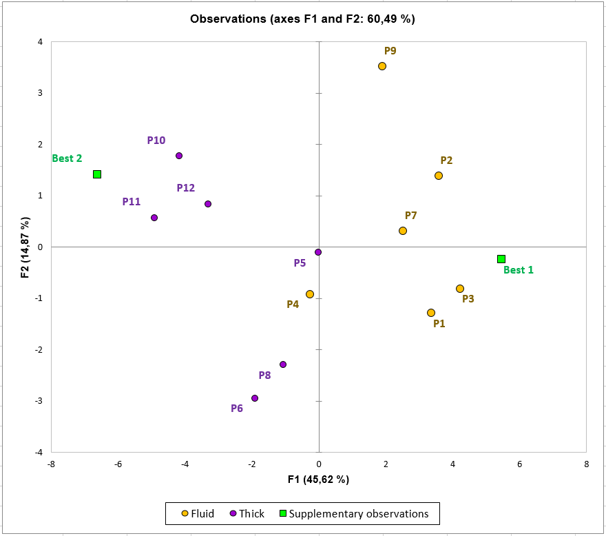このグラフでは、製品 (P1, P2, P3, P7) の1つのグループが、相関プロットの右半分にある審査員に好まれることがわかります。これらの消費者は、これらの製品の酸味が好きです。 Best 1 プロトタイプは、この種の消費者の期待に適した製品のようです。さらに、この製品のグループは、fluid texture(流動的)の特徴があります。 一方、製品 P10, P11, P12 は、相関プロットの左半分の審査員に好まれます。この種の消費者は、甘みがあり濃厚な特徴の製品が好きなようです。 Best 2 は、この種の消費者向けに良い候補のようです。