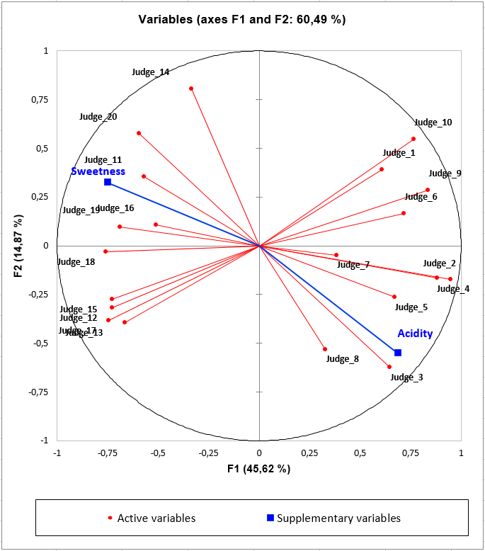 ここで、追加変数 Acidity および Sweetness が、酸味が特徴の製品を好む人、甘い味の製品を好む人、という2種類の消費者を識別することを可能にします。この情報なしでは、それらの消費者の2つのクラスタの間の違いを説明することができないでしょう。オブザベーション・グラフの右側の製品は、酸味で特徴づけられており、右の審査員のクラスタに好まれます。オブザベーション・グラフの左側の製品は、甘みで特徴づけられており、左の審査員のクラスタに好まれます。