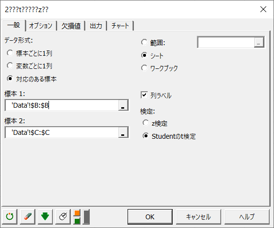 ボタンをクリックすると、ダイアログ・ボックスが現れます。そして、Excel シート上でデータを選択します。対応のある標本オプションを選択してください。