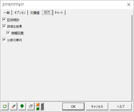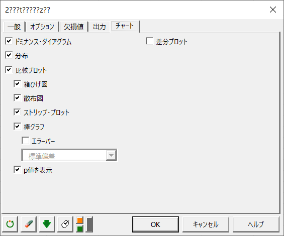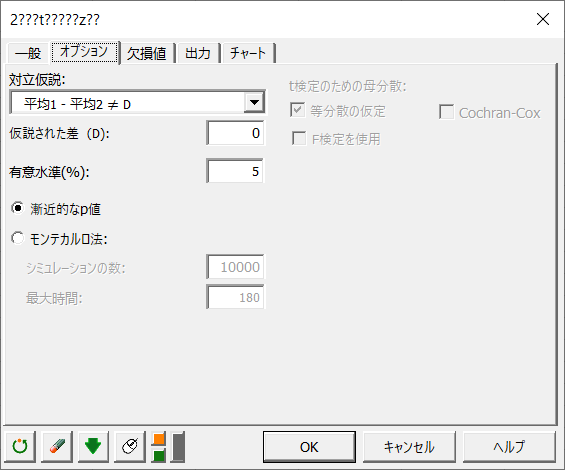 オプションタブでは、仮説された差フィールドで0 を入れます。これは、我々が検定したい帰無仮説: 平均(標本 1) - 平均(標本 2) = 0 を反映しています。