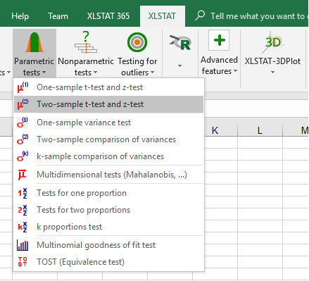 XLSTAT-Proを起動すると、XLSTAT / パラメトリック検定 / 2標本のt検定および z検定 コマンドを選択するか、パラメトリック検定メニュー(下図)の対応するボタンをクリックします。