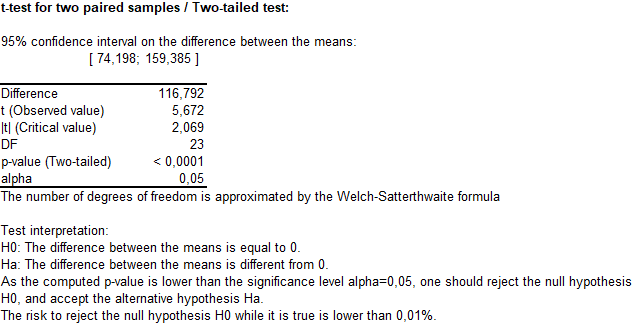 あらゆるパラメトリック検定と同様、Studentの対応のあるt検定は、対応のある差が正規分布に従う場合のみ信頼できます。 それらの差を計算して、正規性検定に関するXLSTAT チュートリアル に従って分析できます。この条件を尊重しないなら、1つの解決策は、代わりに Wilcoxon ノンパラメトリック検定を使用することでしょう。