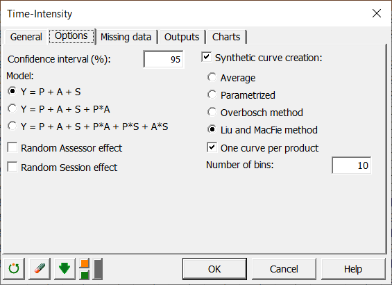 左側で、抽出されたパラメータで実行するべきANOVAのために、3つのモデル設定が提案されます。我々は、製品、審査員またはセッションの間の交互作がないと見なされる最初の設定を選びます。右側で、合成曲線作成のオプションを有効にして、Liu and MacFie 法を選択できます。製品ごとに1つの合成曲線を生成したいので、製品ごとに1曲線のチェックボックスが有効になていることを確認してください。最後に、ビン数をデフォルト値の20に設定してください。