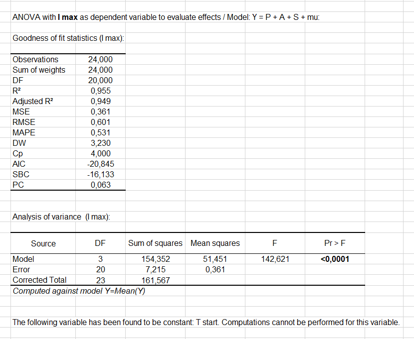 最後に、各パラメータを従属変数としてみなすANOVAの一覧が表示されます。たとえば、T start 変数は定数であるとわかったことが、下記からわかります。これは製品間を区別する情報を何ももたらさないので、分析から除かれました。