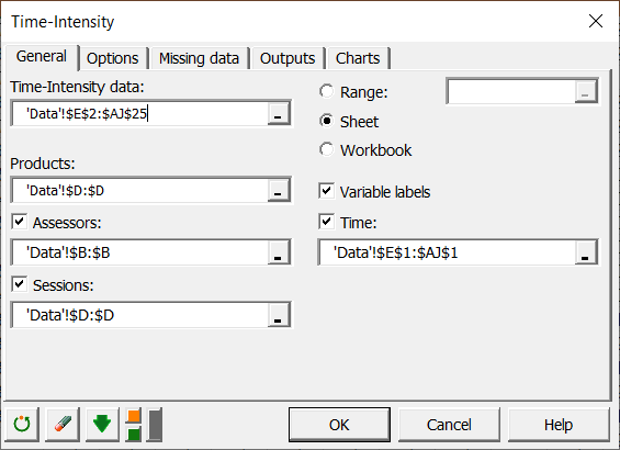 ボタンをクリックすると、ダイアログ・ボックスが現れます。まず時間強度データと製品識別子を選択してください。それらの2つの変数は、XLSTAT内でTI分析を実行するのに必須です。我々の事例では、審査員、セッションおよび時間ベクトルの識別子もあります。つまり、下記に示すように対応する領域を有効にして、データを選択できます。各変数のラベルがあるので、変数ラベルチェックボックスをチェックしてください。