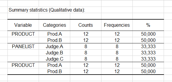 結果のシートでは、最初の表にProduct 変数、審査員、セッションに関する記述統計を表示します。下図でわかるように、各変数の各カテゴリは、データセット内での発生の度数と共に一覧されています。