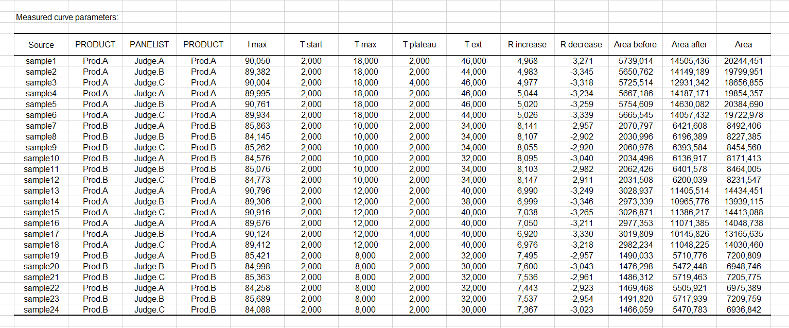 下に示す次の表は、測定曲線パラメータを要約します。それらは、24個の個別強度曲線で測定された10個の記述量です。表は、すべての情報が単一の表に集められるように、対応する製品、審査員、セッションも示します。