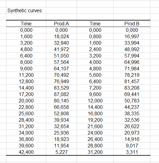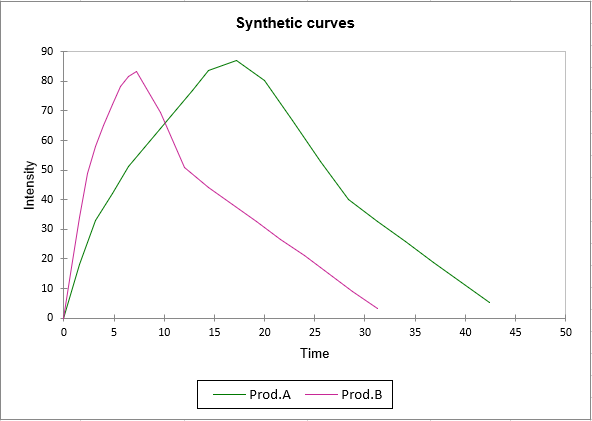 続く表は、合成曲線の表です。下記に示すように、合成曲線、製品A、製品Bの強度と時間座標を与えます。