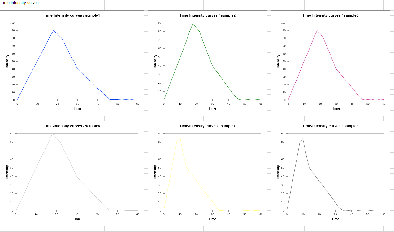 下記に示す個別の時間強度曲線を表示するチャートの集団がパラメータ表に続きます。各曲線が単一のチャートに表示されています。個別I曲線を視覚的にコントロールすることが、時間強度分析では重要です。ユーザーは、潜在的な記録問題を識別するために、領域の専門知識を使用するべきです。