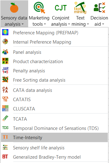 まず、Excelでダウンロードしたファイルを開き、XLSTATを有効にしてください。XLSTATが開かれると、XLSTAT / 高度な機能 / 官能データ分析 / 時間強度 (下図)を選択してください。