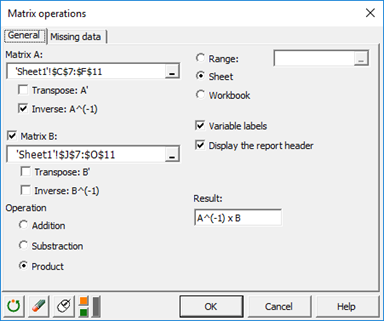一般タブで、行列 Aのデータを選択し、逆オプションを選択してください。そして、行列Bを有効にして、Excelシートからこの行列に対応するデータを選択してください。最後に、A^(-1) で表記されるAの逆と行列Bの乗法を実行します。ダイアログボックスの結果フィールド内に式が表示されます。