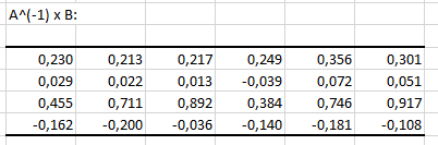 下記のように、逆行列Aと行列 Bの積が新しいシートに表示されます: