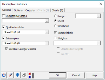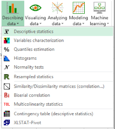 分割表(クロス表ともいう)は、2つのカテゴリカル変数の間の関係性を要約する有効な方法です。 XLSTAT は、3D表示による分割表の生成と、2つの変数の間の関係性を定量化する複数の統計量を計算するツールを提供します。こちらのチュートリアルをチェックしてください。 以下の動画は、ExcelとXLSTATを用いた質的変数の記述統計です。