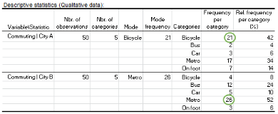 - 最頻値 および最頻度数: 都市Aに住む人びとは自転車(Bicycle)を好み (最頻度数=21)、一方、 都市B に住む人々で最も人気のある通勤手段は地下鉄(metro)である(最頻度数=26)。