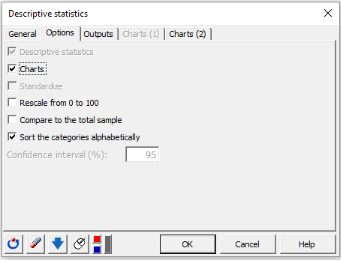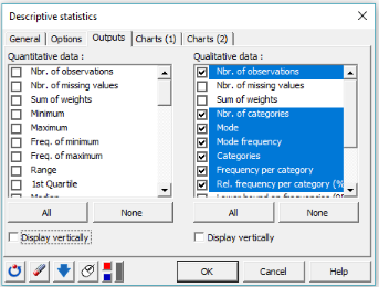 出力タブでは、以下の統計量を選択します:オブザベーションの数、カテゴリの数、最頻値、最頻度数、カテゴリ、カテゴリごとの度数およびカテゴリごとの相対度数 (%)。