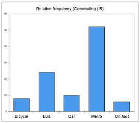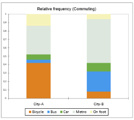 最初の図から、bicycle が都市Aの最頻カテゴリで、回答者の少なくともi40%がこの通勤手段を選んでいることが簡単にわかります。都市B の個人はmetro と bus のバーが合計で70%を超える相対度数なので、公共交通機関を好むようです。