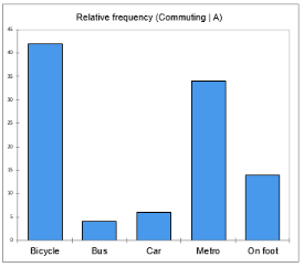 - カテゴリごとの相対度数 (%): 都市Aに住む回答者の42%が 自転車で働きに行き、一方、3% だけが自動車を使う。