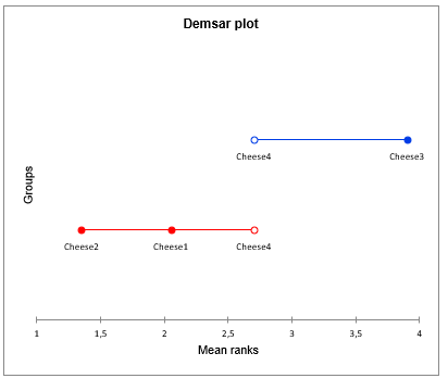 次の結果からは、ANOVAにおいて多重比較検定を実行するのと同じように、どのチーズが他とは違うかを特定することができます。k グループにおいて多重比較が行われている事実を考慮するため、Nemenyの手順が用いられます。下記の要約表から、チーズ2と3、2と3、1と3は異なると識別できます。再びデータを見てみると、3番目のチーズが明らかに最も固いです。