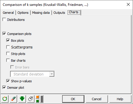 チャートタブで、箱ひげ図とDemšar プロットを有効にします。これらのチャートは、グループの各対での有意差を簡単に可視化することを助けます。