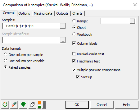 一般タブで、まず対応のある標本オプションを有効にして、標本フィールドをクリックし Excel シートでデータを選択します: 4種類のチーズ(または標本、または処置)に対応するデータの4列をマウスで選択します。