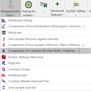 XLSTAT-Proを起動し、XLSTAT/ ノンパラメトリック検定 / 対応のあるK標本検定 (Friedman...)を選択するか、または ノンパラメトリック検定の「ツールバー (下記参照)から対応のあるK標本検定(Friedman)ボタンを選択します。