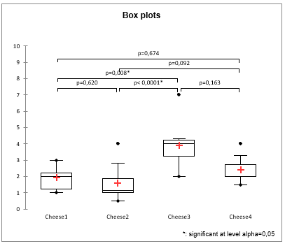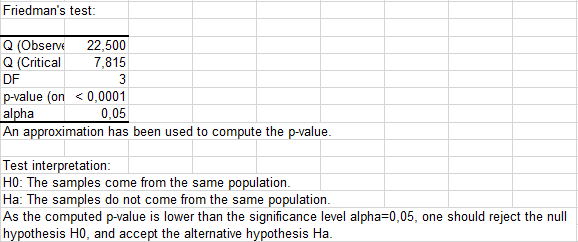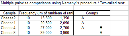 最初の表はFriedmanのQ統計量とそれに対応するp値を表示します。p値は、帰無仮説が真であるにもかかわらずそれを棄却する確率は 0.0001より小さいことが分かります。その場合、チーズの間に差がないという帰無仮説を安全に棄却できると結論できます。