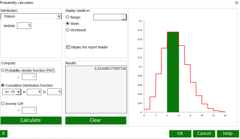 ダイアログ・ボックスの中央部で、どこに出力を表示させたいかを選び、計算された確率をインタフェース内に可視化します。